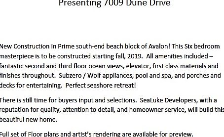 New Construction in Prime south-end beach block of Avalon! This Six bedroom masterpiece is to be constructed starting fall, 2019. All amenities included – fantastic second and third floor ocean views, elevator, first class materials and finishes throughout. Subzero / Wolf appliances, pool and spa, and porches and decks for entertaining. Perfect seashore retreat! There is still time for buyers input and selections. SeaLuke Developers, with a reputation for quality, attention to detail, and homeowner service, will build this beautiful new home. Full set of Floor plans and artist’s rendering are available for preview.
