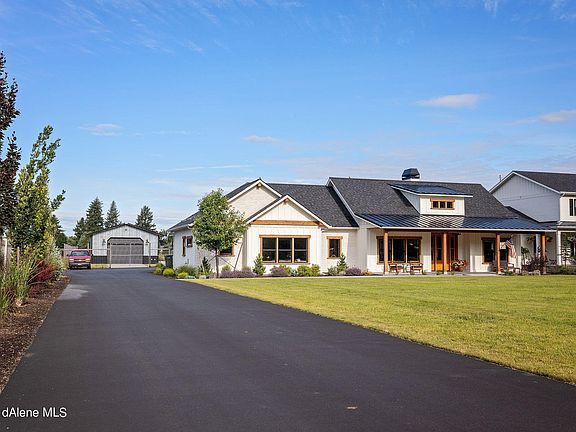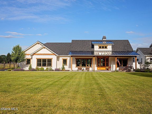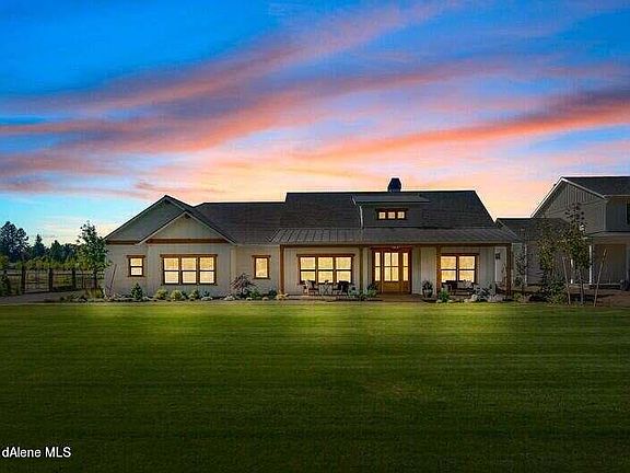 Welcome to Dalton Gardens! This one-of-a-kind single-level custom built modern farmhouse is located on the prestigious 16th Street of Dalton Gardens. This home is situated on 1.65 acres of well-manicured lawn with plenty of space for your farm animals to roam. Inside, you'll find 10ft ceilings, quartz and marble countertops, a hand-glazed tile backsplash, a 9ft quartz island, top of the line appliances, designer lighting fixtures, a masonry fireplace with a basalt surround with a custom basalt and copper wood storage, an open concept, and tons of natural light. Escape to your private master suite and enjoy the spacious closet with built-ins and relax in your walk-in shower with views from the windows of the sunrise over Canfield Mountain. In the warmer months, open your double oversized sliding door onto the 500sqft tongue-and-groove covered back patio and enjoy the sunset while you entertain guests in your private backyard. Featuring big cabin fir-wrapped windows, a mixture of brick and board-and-batten siding, and elegant landscaping filled with perennials around every corner, the curb-appeal of this modern farmhouse will take your breath away. Step out back and enjoy your own personal organic gardens and fruit trees, or fill the 30 x 40, fully insulated shop with all of your outdoor toys. This incredible home offers a country living experience right in the heart of Coeur d'Alene!
