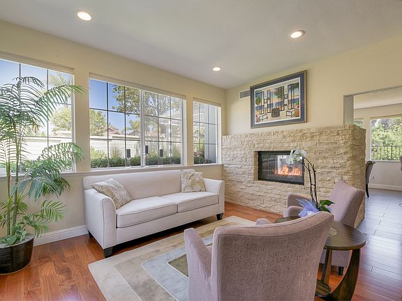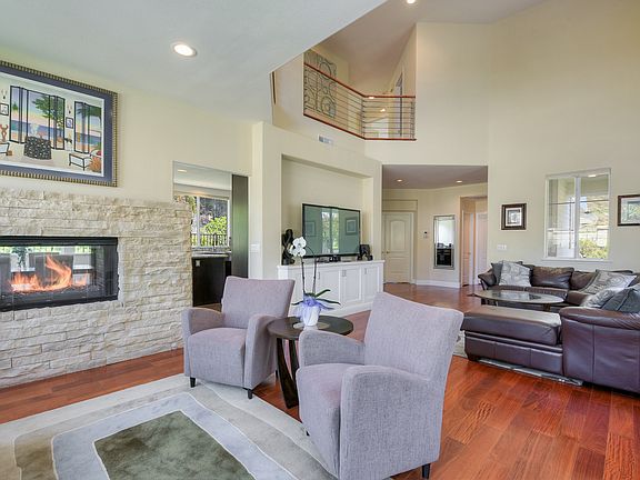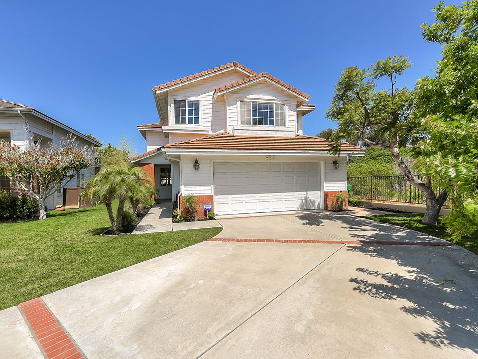 Located at the end of a quiet, private road surrounded by lush greenery and canyon views, this highly upgraded La Costa home features 4 bedrooms, 3 full baths and an added loft. This bright and open home boasts high ceilings, hardwood mahogany flooring, and a double-sided fireplace in the living room. The owners have installed window treatments throughout, added central air conditioning, built in cabinetry, and modern stainless railings. The upgraded eat in kitchen overlooks the sweeping canyon and is equipped with stainless steel appliances, granite countertops and a full height granite backsplash. A laundry room and full bedroom and bath complete the downstairs. The peaceful backyard has been fully renovated with new grass, a stacked stone planter, and upgraded landscaping. The upstairs features a large master bedroom with double doors, a walk in closet, fireplace, and numerous windows allowing one to fully appreciate the unobstructed views of the surrounding open space. The striking master bathroom has been fully remodeled in beautiful gray and white tones with large format tile, marble countertops and a freestanding soaker tub. Additional upstairs bedrooms are generously sized and feature custom woodworking and closets with built in storage. The home has an added loft that is perfect for a playroom or office. The community pool and spa is a one minute walk away and three playgrounds are conveniently located in the neighborhood. Situated on a rare private lot with low HOA fees, no Mello-Roos, and extensive updating, this home is not to be missed!