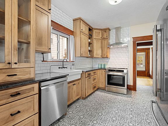 Highlights include a newly updated kitchen featuring custom Amish maple cabinetry, apron sink, stainless appliances, stone countertops with tile backsplash. All rooms and closets are freshly painted for a turnkey feel. Meticulously updated while preserving its architectural soul, this home also offers hand-plastered ceilings and new fixtures.