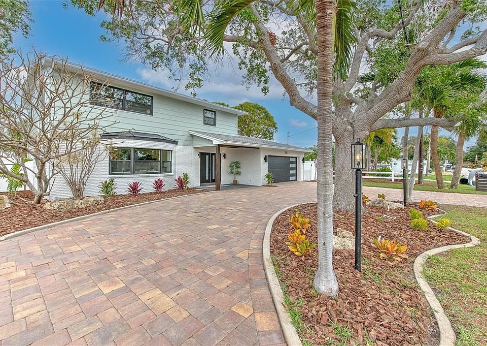 St. Pete Beach welcomes you in this thoughtfully, meticulously updated modern coastal home with four bedrooms, four full bathrooms and a gorgeous saltwater pool with an outdoor shower. This home is waiting for a buyer who appreciates clean lines, lots of natural light and a relaxed, contemporary feel. After enjoying a drive by the beaches and turning into the sought-after neighborhood of Bahia Shores, you and your guests will be welcomed with a landscaped corner lot and a circular driveway, providing ample parking. The updated two-story facade boasts new hurricane-resistant windows throughout, including the slider out to the pool, the front door and the garage door. There is all new exterior lighting, a covered front porch and new double front doors. From the welcoming foyer, you are greeted by a beautiful, custom staircase and to your left, a spacious great room, generous dining room, and bright and completely renovated gourmet kitchen. The spacious kitchen offers ample quartz countertops, custom solid wood cabinetry, stylish floating shelves, a stunning range hood and beautiful shades of blue backsplash, bringing a subtle reminder that you live near one of the most beautiful beaches in the world. The dining room and kitchen enjoy a view of the private pool where you can keep one eye on the guests while prepping your next feast. You can also admire the private pool from the florida room, which boasts wall-to-wall windows and a gas-powered fireplace with a custom copper hood, perfect for gathering around after a day at the beach. This home offers the luxury of two master suites, one on the first floor and another on the second floor, alongside two other spacious bedrooms which both offer a view of Boca Ciega Bay. This property has undergone a comprehensive renovation, bringing a fresh, modern feel to this traditional home including flooring, fresh paint inside and out, completely updated bathrooms, one new AC unit as well as all new doors and custom-built trim. This is no cookie-cutter home! Situated in the heart of St. Pete Beach, this home is ideally located for those who appreciate the beauty of the Gulf Coast. Residents can enjoy easy access to the beaches with proximity to two pubic beach access locations, beach bars and restaurants at the end of 59th, as well as popular local amenities, restaurants, and shopping - while still being a short drive from all that downtown St. Pete and downtown Tampa have to offer. *Price Adjustment Under Recent Appraisal* Room Feature: Linen Closet In Bath (Primary Bedroom).