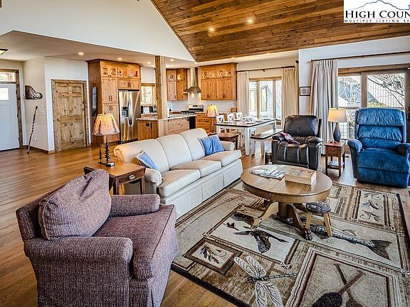 NEW SKIWAYS Home - Architecturally designed - Elevation: 4,912 feet - Level entry, all on one level living, handicap accessible, long range & ski slope views, creek, Tastefully furnished and decorated. MAIN FLOOR - Large Great Room & Fireplace, dining, kitchen, Laundry, PRIMARY bedroom with covered deck and large bath, TWO Guest bedrooms, laundry & Foyer. Covered and open decks off great room, primary bedroom & dining area with Fire pit and deck furniture. UPPER FLOOR: Large 16'X21' Loft bedroom & bath. LOWER BASEMENT LEVEL: oversized heated two car garage, concrete floored heated exercise room, golf cart garage, storage  16'X29'- could be finished as a bedroom & bath - water & sewer is available. Storage area on the south and north side of the garage with high ceilings that could be floored and finished. Basement level is the same size as the main floor and it is heated. 550 feet as the crow flies to beginner Carolina Caribbean ski slope. Multi-car parking on both sides of the house. VIRTUAL TOUR and FLOORPLANS ONLINE - 150 MPH Anderson windows, roofing & siding. Restaurants across the street. Great Place to watch July 4th and New Years fireworks. CURRENT Beech Mountain Club membership at the Sport Level  available at closing upon payment of the transfer fee - a savings of more than $ 20,000. Basement level including the garage is heated and commercially dehumidified. Basement level is the same size as the main floor - 1893 sq ft. Dining, Living and Primary decks - all connected : 530 sq.ft.