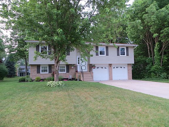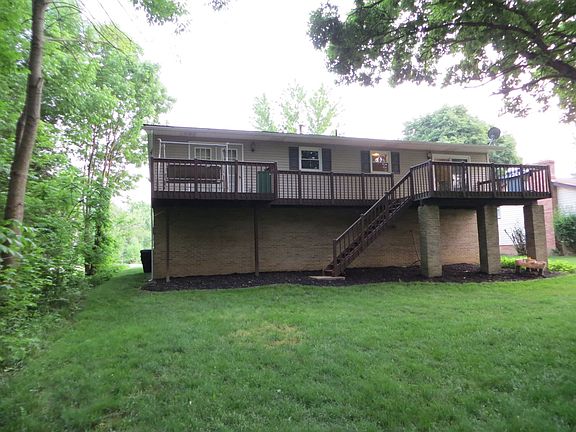 Kid friendly neighborhood. New roof and hot water tank 2016. Updated/remodeled both bathrooms. New refrigerator, microwave, and dishwasher in 2015. City water and sewer. Three bedrooms. Master has french doors leading to deck. Main bathroom access from master bedroom. Finished half basement with laminate. Large eat-in kitchen with sliding glass doors from eating area to deck. There is a large shed in backyard for lawn equipment and more storage. Large deck and very nice back yard. Creek runs along the side closest to the garage.