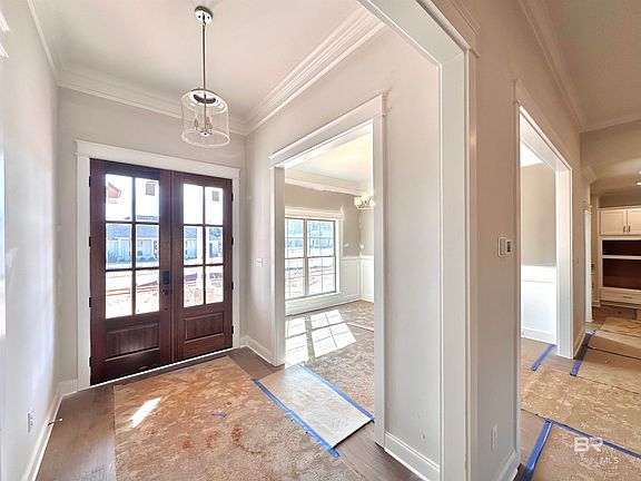 Welcome to the beautiful wooded neighborhood of Fox Hollow, and welcome to the Cardinal Floorplan! This home sits on a large corner lot and has a welcoming entryway with double 8' mahogany doors that invite you into an open floor plan with high ceilings, beautiful trim, wood flooring in entry/living, kitchen, hallway, and primary bedroom! Tile in laundry, and all bathrooms! The gourmet kitchen features white cabinets, beautiful granite countertops, a white farmhouse sink, gas cooktop with hood, wall oven/microwave, and dishwasher. The secluded primary suite is tucked away for privacy. The ensuite bath has a dual vanity, soaking tub, and spacious walk-in shower. The oversized walk-in closet is a dream with loads of storage. This amazing floor plan has three additional bedrooms and an additional 2 bathrooms PLUS a half bath. Bedroom 2 off the entry has its own ensuite bath, perfect for guest or home office. Complete with 1-year builder warranty, and a "Connected Home" package including Ring doorbell, outdoor camera, an Echo dot, smart thermostat, keyless front door entry, and 3 smart switches! One-year renewable termite bond with Formosan coverage, and a 5-zone irrigation system. Fox Hollow is a Fairhope single tax community. Home is scheduled for completion March 2024