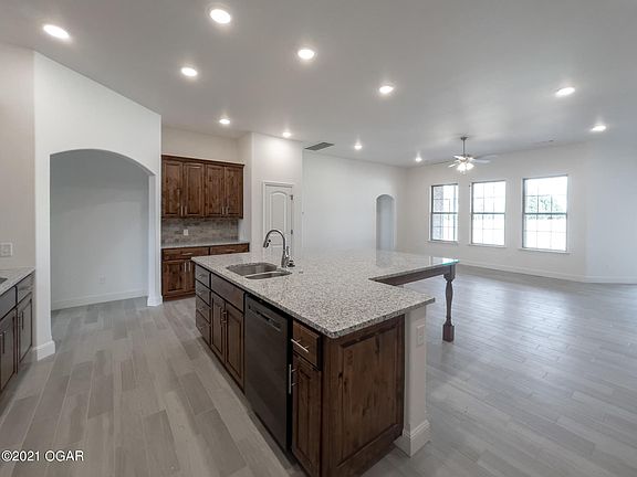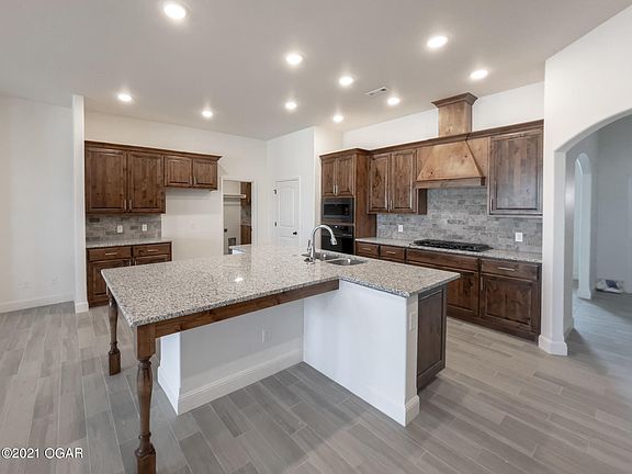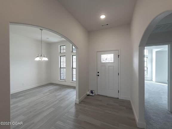 This Carl Junction new construction is sure to impress with its beautiful brick and stone exterior. The 2600 square foot floor plan features 4 bedrooms, 3 bathrooms, 10-foot ceilings, and a formal dining room filled with an abundance of natural light. Granite counters, custom cabinets, porcelain tile flooring throughout. The spacious, open concept kitchen plays host to a walk-in pantry, recessed lighting, stainless appliances, a table island perfect for family gatherings, and connects to the comfortable living area! A fireplace, hardwood floors, smart home package, walk-in closets, utility room, covered front porch and back patio, as well as an attached 3-car garage make this home complete!