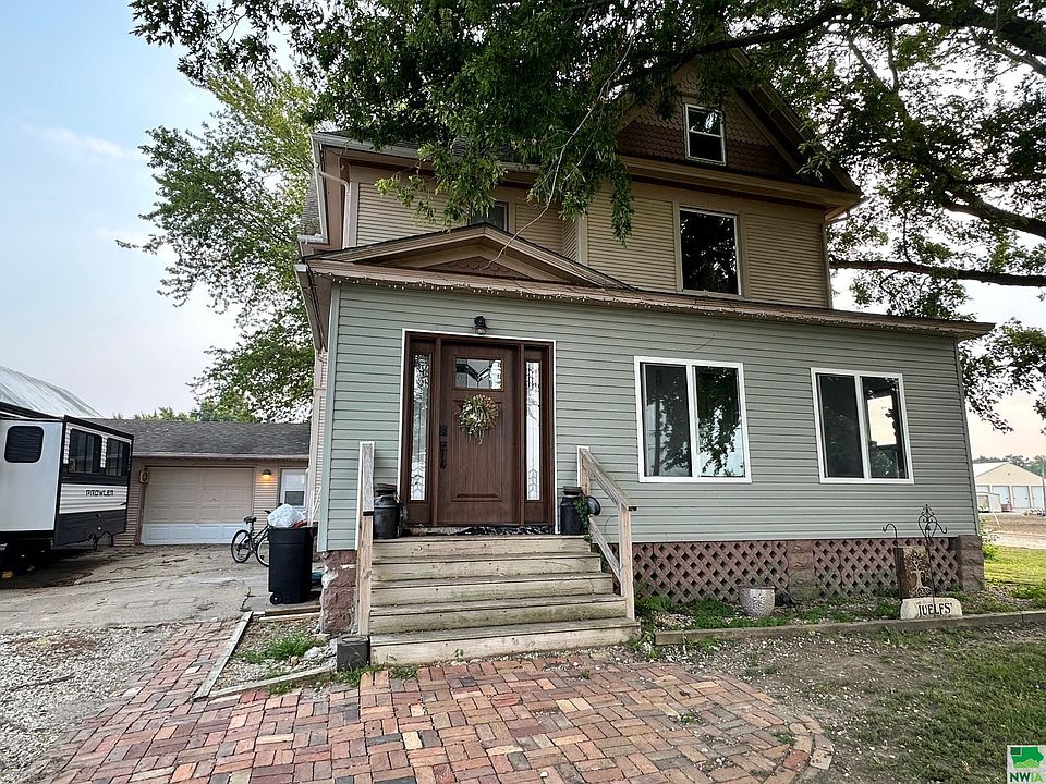 This is a beautiful large Victorian type of home. There are 3 bedrooms and 1.75 baths. You will enter through a beautifully finished enclosed front porch into a foyer with an open staircase. As you proceed through the house you will see the beautiful woodwork colonnades entering the living room then on to the dining room with pocket doors between the two rooms. The dining room leads to a den with pocket doors that could be converted to a bedroom and an attached 3/4 updated bathroom...... or from the dining room you can enter the large kitchen with ample cabinets! The laundry room is located in the back porch that leads to the large 2 car attached garage. Also from the kitchen you can enter a hallway that has a wonderful large pantry off of it and a place to hang your coats and hats. From the front foyer you can take the beautiful open staircase to the upstairs where there are 3 bedrooms and a full bath. One bedroom is considered the master as it is a very large room with a large walk in closet. All the bedrooms, the den, and bathrooms have had the plaster lathe changed to be insulted and drywall. This is a Holstein staple property located on the edge of town. Not only do you get this large home, you also get the large pole shed that is insulated and has a shop room 16 x 35 with heat and AC. The rest of the building has two 12' overhead doors and a large balcony area for storage. Where else can you get a property like this with all the city amenities!!