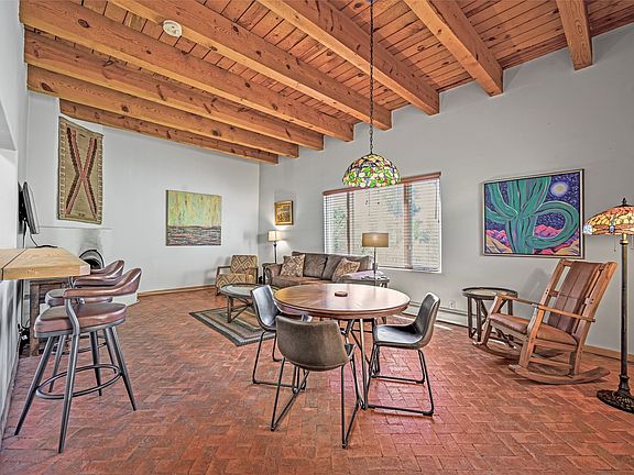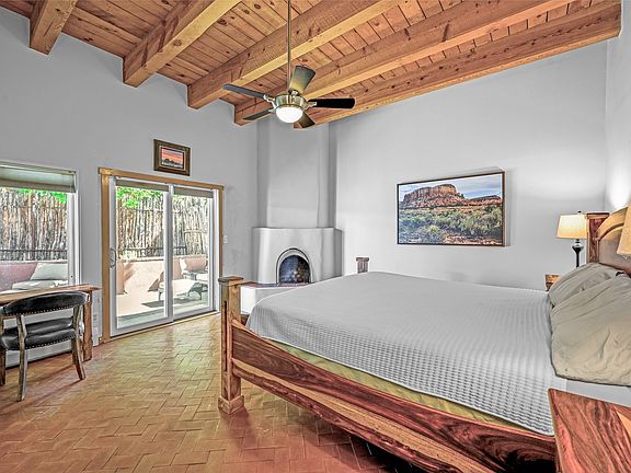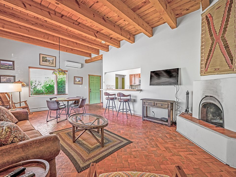 Canyon Road. This inviting home features high beamed ceilings, two cosy kiva fireplaces, and