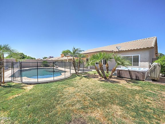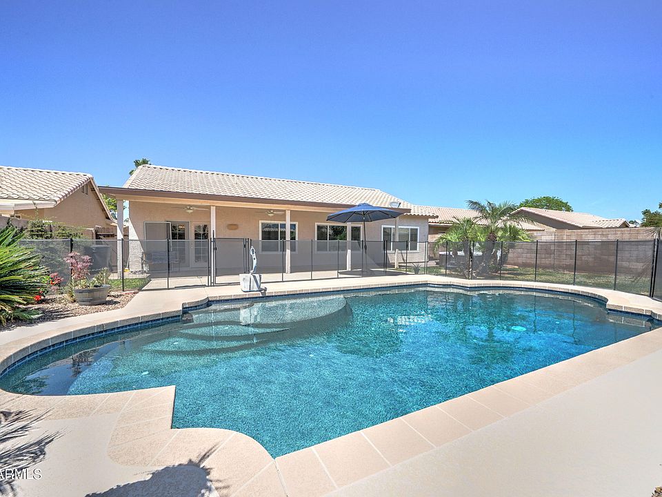 Gorgeous single level home with open floor plan & large rooms! Includes a sparkling pool (built in 2007) & newer spa , long covered patio & extended paver patio, grassy area & an outdoor sink! The extended garage is approx. 24' with 2-4 feet extra length at step. Vaulted front room W/coat closet & view of pool. There are extra cabinets & counter in dining area & newer appliances in the kitchen. The family room has French doors to the back yard & access to the laundry area with pantry. The primary bedroom is large & has a walk in closet & newer shower . There is also a linen closet in the hall. Exterior was painted 3-4 years ago, newer flooring, some new windows, newer toilets & showers & washer/dryer is only 4-5 years old -A/C replaced in 2012 -Fabulous Home