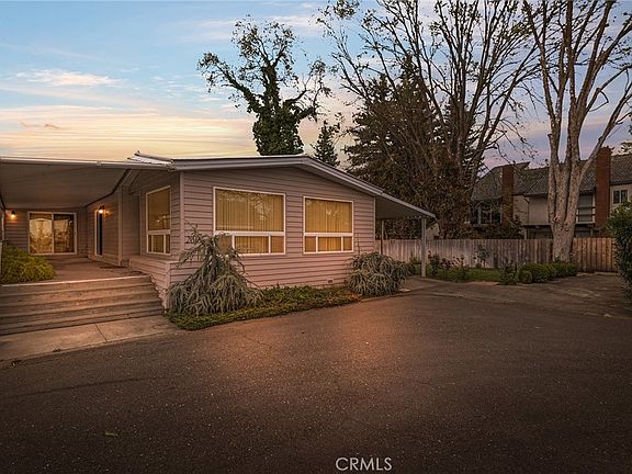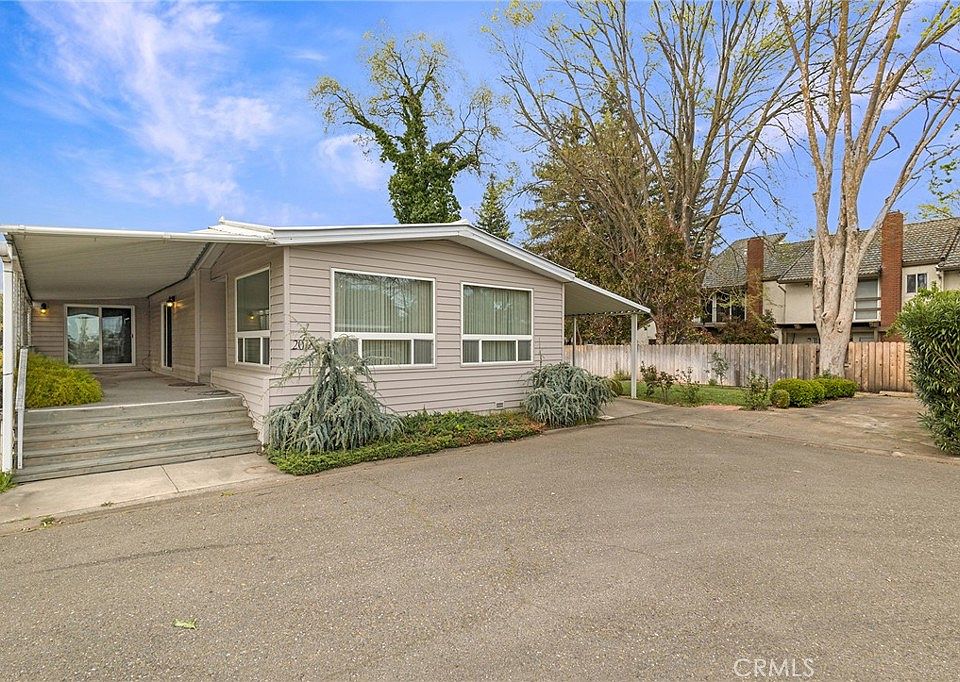 Located in Casa De Flores 55+ community, unit 201 is unique in many ways—it's the original manager's unit that affords additional lawn and garden area, as well as a second concrete pad for off-street parking that others lack. The grounds include several fruit and citrus trees, with ample room to add a gazebo enhancing the outdoor experience, along with a 10x12 Tuff shed, a second storage unit and a two-car-length carport for convenience and storage needs. This distinctive residence boasts a total dimension of 24' wide x 40' deep, with an additional 40' width across the back, forming its rare T-shape design.