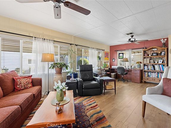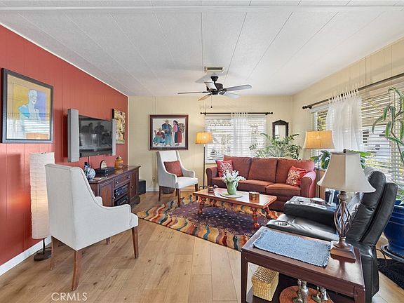 This completely remodeled 2 bedroom, 2 bath home is located in the popular Casa De Flores 55+ Senior community. Beautiful new luxury vinyl plank flooring graces the entire home. The kitchen has been completely updated with new cabinets, solid surface countertops, and stainless steel appliances, which include a gas range. Dual pane vinyl windows and ceiling fans throughout help ensure year-round comfort and energy efficiency. One of the standout features of this home is the abundance of closet and storage space. The built-in closet organizers in both bedroom closets ensure that your belongings are neatly stored away, and you'll find built-ins in the dining room, allowing for display of your treasured items. The enclosed porch, not included in the square footage, provides additional living space, perfect for relaxation or entertaining guests. You will be delighted by the beautifully landscaped yard, including a raised garden bed and a lemon tree. There is a front deck and an expansive back patio offering several lovely spaces to enjoy relaxing in the fresh air! A storage shed provides ample space for your outdoor tools and equipment. The park amenities include a swimming pool and club house that offers an abundance of activities to homeowners.
