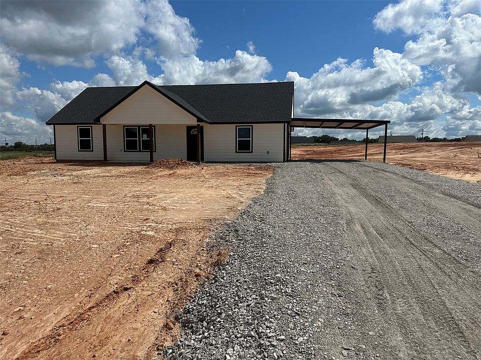 New build home on one acre located in a quiet neighborhood. This house has three bedrooms, two baths. The kitchen has an island, custom cabinets, stainless steel appliances, and tile flooring throughout the house with carpet in the bedrooms. Master bath has a walk in corner shower, walk in closet and dual sinks. Close to schools and located between Springtown and Weatherford. No HOA and ask about builder incentives.