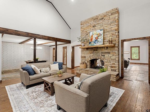 Exquisitely designed stone and cedar home sits atop a charming corner lot. Entry opens up to a gorgeous vaulted living room with stacked-stone, double-sided wood-burning fireplace, leading into a massive vaulted showroom, complete with extra living area/theater room, and half bath. Custom kitchen boasts commercial oven, farmhouse sink, backsplash, marble countertops, pantry, brick flooring, and beautiful built-ins off the breakfast nook. Second entry opens to optional play/game room, oversized mud area, huge utility room, vault, and extra pantry/craft storage closet. Split for privacy, master bedroom has a huge walk-in closet with personal built-ins and stunning hardwood floors. Master bath includes marble counters, separate shower & tub, and abundant custom storage. Upstairs consists of large bedroom with ensuite, 2 bedrooms with jack & jill bath, and spacious office or 5th bedroom. Exterior boasts patio and fire pit space overlooking Dellwood Park. Wood shutters, cedar beams, and one-of-a-kind amenities throughout!
