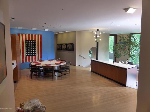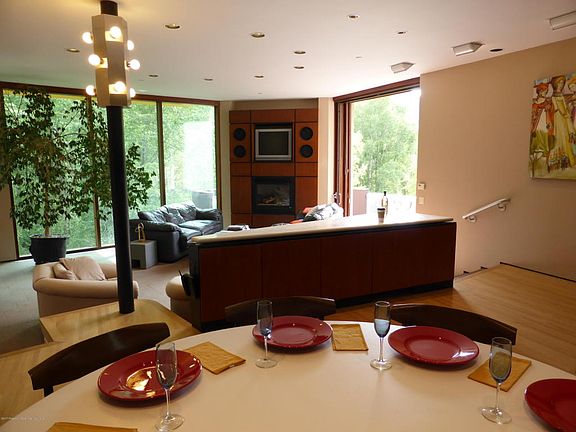 Architect's dream home designed for himself, walkable to downtown. River frontage with shared access to a tennis court all across river from John Denver Sanctuary at Rio Grande Park. Contemporary in the philosophy of the Bauhaus. Gracious entry designed for your art, then flowing into the entertaining area. Complete living on the main floor with direct access from the heated garage to kitchen, living room, dining area, master suite, office, laundry, and powder room. Views of Mt Sopris - Aspen Mountain - Independence Pass. Fully sprinkled. AC in master suite and kitchen. Entry plus all 3 decks snow melted. 6,993 built square feet per assessor including 617 s/f heated garage and 113 s/f unfinished basement. 5 bed, 5 1/2 bath.