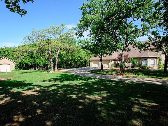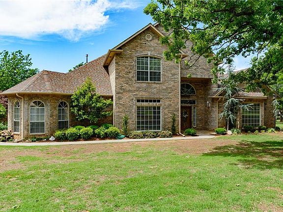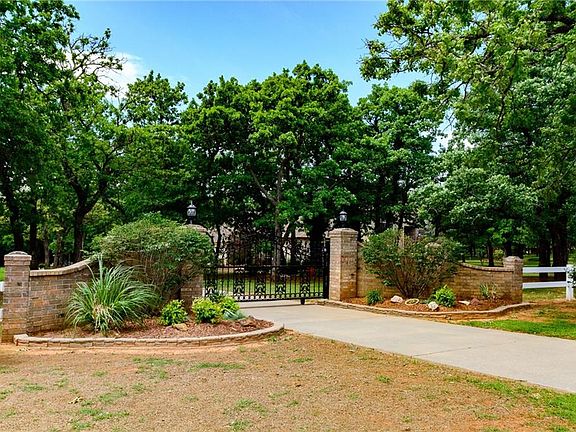 A serene setting on over 2.5 acres with a brick and iron gated drive, mature trees and serene views! This home offers a spacious living area with gas fireplace and patio access! French doors open into the study with a wall of windows overlooking the treed backyard and featuring tile flooring, a built in desk and shelves with plenty of extra space for living area! There is a formal dining room and a casual eating area off the kitchen with bay window views! A large upstairs game/media room is versatile for your needs! The kitchen is spacious and offers plenty of storage, a 5 burner gas cooktop and pantry. You will love the back patio with flag stone floor and iron railing. This is a great place to sit back and enjoy the park like setting! There is a 2 car attached garage and 1 car detached garage, a full sprinkler system and front gate is remote controlled. A beautiful location in north Blanchard with easy access to Norman and OKC! The setting is beautiful nestled in the mature trees!