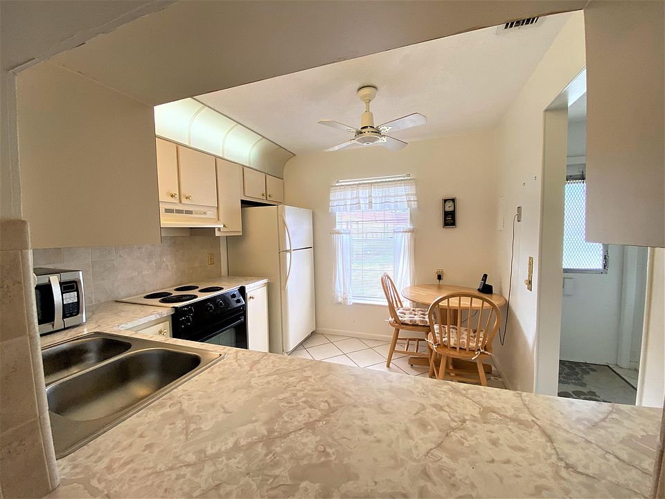 This CORNER VILLA gives you more windows making it light and bright. Parking is right out your front door. TILE flooring throughout. Triple sliding glass door takes you out to the screened/enclosed porch. Porch opens to the open air patio perfect for BBQing and catching some of the Florida sunshine. NEW A/C and dishwasher. Walking/jogging, biking path right in the backyard. Community has clubhouse with activities, pickleball, tennis, bocce, shuffleboard, 2 heated pools (one for laps and one for socializing), exercise room, lakes throughout the community. Pet friendly up to 22lbs, motorcycles and rvs can be stored in a lot for a small fee, pick up trucks allowed. No rentals for 1 year.