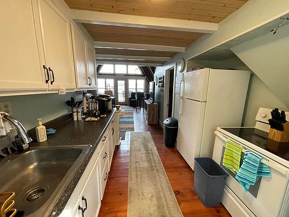 If you've been dreaming of 3-season lakeside living, look no further. This quintessential A-Frame cottage has many wonderful features. Starting outside, enjoy the private lot and stunning views from the cove this cottage is nestled on. Store your lake toys & tools in the two sheds included with the property. The newer roof & paint job make the outside of the cottage so inviting & project-free. Additionally, the deck was just rebuilt - with direct access to living space you'll be inside-outside entertaining with ease. Stepping inside, immediately notice the lake views all the way from the back entry (kitchen) of the camp. Here in the kitchen, enjoy ample storage, function, and new cabinets giving this space a modern feel. The living room vaulted ceilings and well-appointed windows take full advantage of the natural light & scenic water views. Open up the doors & windows in the summer & cozy up by the pellet stove on the colder fall days. There are two bedrooms on the first floor and the living room is open to the loft up above. Both bedrooms are a great size. The 3/4 bath completes the first floor - so nice to have complete first floor living as an option! Step up the ladder and picture visiting friends, kids, etc. settling in for the evening in the extra sleeping space! Isn't it every kid's dream to have a fun loft to themselves?! The two A-Frame peaks offer a cozy space for a twin bed each and the primary loft space has ample room for two larger beds. We'd be remiss if we didn't highlight the character of this A-Frame, from the wide plank pine wood floors to the beautiful wood ceilings throughout. With access to two lakes via boat (Big & Little Madawaska Lakes), come enjoy everything this lakeside cottage has to offer!