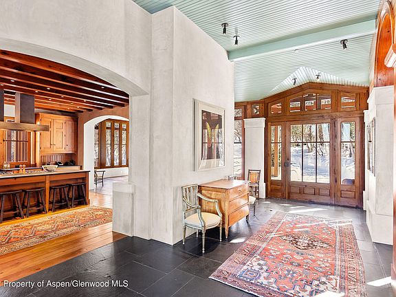 A breathtakingly beautiful French Country Manor just outside of Aspen, Colorado is situated on a treed lot, for ultimate privacy, yet with incredible views of all the surrounding mountains, the home would be comfortable among the most prestigious European homes. The beautiful, oversized wood and glass front door allows immediate access to gorgeous mountain views. The entry is grand and gracious with heated slate floors and almost floor to ceilings windows. There is incredible woodwork throughout the home, from wood detailing in the ceilings, to gorgeous custom-made cabinets and intricate wood bannisters and handrails. Plaster and integrated paint walls combined with the honey colored wide plank flooring creates an atmosphere of luxury and warmth.
