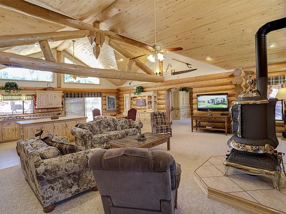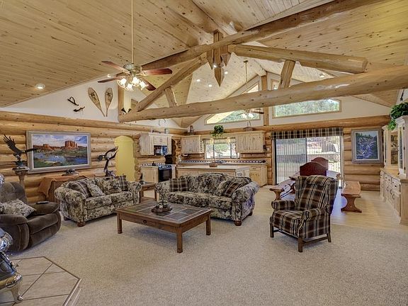 Gorgeous one of a kind Pioneer log home. Beautiful large kitchen, dinning room, master bedroom, and bathroom. Peaceful setting on 2.27 acres with access to the National Forest. There is room for horses, barn, RV, has hookups and clean out, or room for a guest house. Finished basement 1700 sq ft. Golf membership available at Chaparral Pines Gold Club. Currently lots of studio and shop space, easily adaptable for a variety of applications. Custom Built cabinetry accents the massive log structure throughout this country estate. The third bedroom with private bath serves as an amazing art studio. Stone and masonry materials remain onsite for additional projects (ie. an outdoor fireplace and kitchen). Living area and master suite on garage entry level,