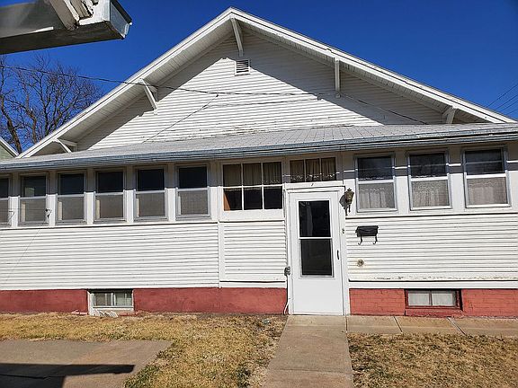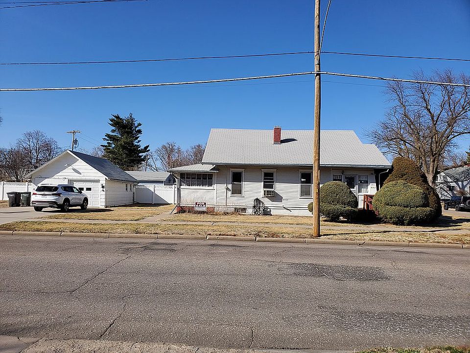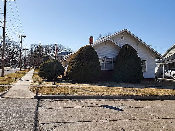 This house has 2 bedrooms one with a walk in closet main floor laundry room nice sized kitchen. Two spacious living rooms with a French door divide. A enclosed porch with a south entrance. Has window air that keeps the home cool. This house is on a large corner lot has a 2 car garage and extra space for a garden or extra space to build.