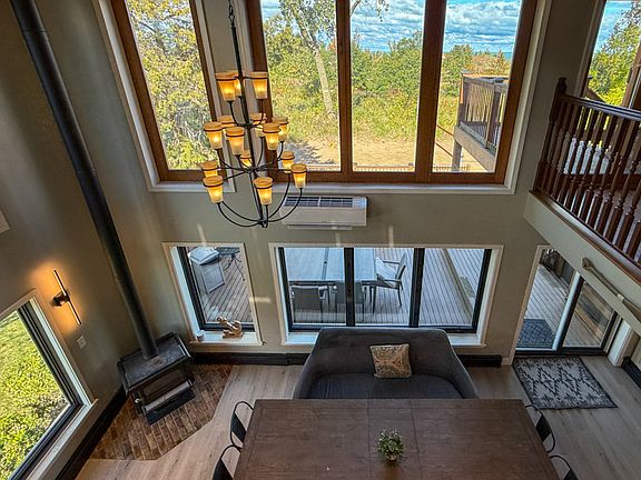 Elyon Hall is a well-appointed beachside getaway located right on the Indiana Dunes National Park, America's 61st, and only 40 minutes from Chicago. With an abundance of luxury amenities, this hidden gem offers commanding views of the picturesque dunescape and Lake Michigan, with close proximity to hiking trails and a semi-private sugar-sand beach, reachable by a short nature trail through the rolling dunes. The main entrance has approximately 6 steps, with handrails on each side, leading up to the front door. Note there are six levels in the house, with only 5-6 steps between each level. The gourmet kitchen is equipped with professional appliances, dual wine fridges, and a complimentary Nespresso and Keurig coffee station. Enjoy a steam shower, cedar sauna, indoor jetted tub, wood-burning stove, and a rec room with a built-in wet-bar and foosball table. Smart TVs, indoor and outdoor Bluetooth speakers, and high-speed Wi-Fi are available for your entertainment. The property features 2000 sq. ft. multi-level decks, a 7-person hot tub, a pro-sand volleyball court, outdoor dining, a fire pit, a grill, and a heated outdoor shower. All supplies are provided, including paper towels, toilet paper, hand dish soap, shampoo, conditioner, body wash, and more. Parking is available for 6 cars in the driveway, with overflow parking free and available nearby. The property is dog-friendly, allowing up to four adult house-trained dogs with fees of $79 for a 2-night stay, $29 per night for a 3-night stay, or $200 per week. Early check-in at 1:30pm CST and late checkout at 1pm CST may be available for an additional fee. Elyon Hall is ideally situated for those looking to explore the natural beauty of the Indiana Dunes National Park. With its close proximity to hiking trails and a semi-private beach, guests can enjoy the great outdoors with ease. The property is only 40 minutes from Chicago, making it a convenient escape from the city while still being accessible to its attractions. The property enforces neighborhood quiet hours from 9PM-9AM. Parties, events, lack of decorum, and disruptive noise will not be tolerated. If neighbors are disturbed, tenants may be asked to vacate the premises with no refund. Outdoor music is not permitted after 9PM. Small wireless Bluetooth speakers are allowed except during quiet hours. Tampering with monitoring devices is strictly prohibited and will result in a $350 fine. No smoking is allowed inside or within 15 feet of any open door or window, with a $1000 fine for violations. Parking on the street is not permitted.