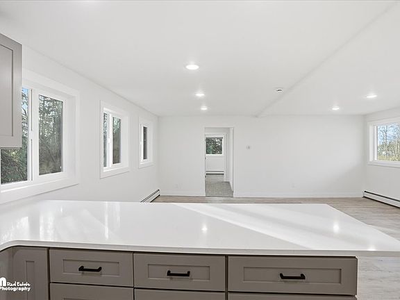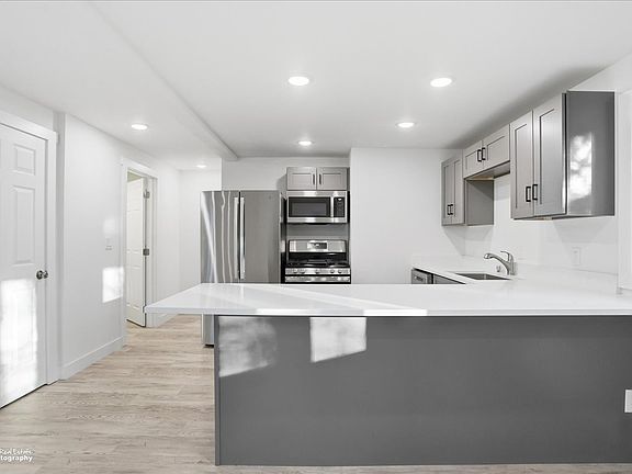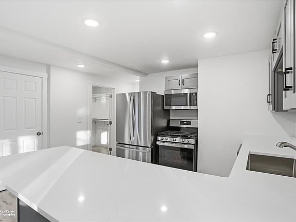 The kitchen shines with quartz countertops, new cabinetry, and stainless steel appliances including a fridge, oven, microwave, and dishwasher.