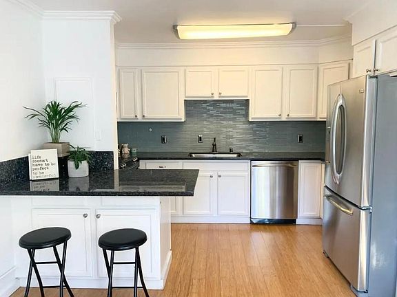 Great location for privacy. Last bldg facing Rock St. Great downstairs unit with lots of natural light and spacious floor plan. Stylishly upgraded kitchen and bathroom with granite, stainless appliances and breakfast bar. Bamboo floors thruout, dual pane windows and inside laundry provide comfort &convenience. New AC/Heat pump, LED recessed lights and crown molding add elegance to this unit. Large and sunny downstairs patio. Convenient to Google, Costco, 101, Central Expressway, downtown and more.