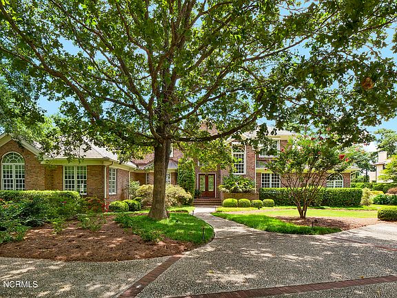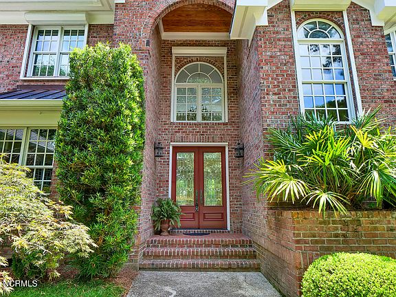 Beautiful custom built brick home in the gated community of Landfall. Home sits on mature landscaped 1.62 acre lot. Overlooks the 8th and 9th holes of Nicklaus Ocean course with pond front and lake views on a cul de sac street. Open floor plan features a family room with fireplace and custom shelving, vaulted ceilings, generous sunlight, chef's kitchen with two solid surface islands, formal dining, formal living. Office with built ins and primary suite with fireplace and sitting area. Primary BR has his and her walk in closets and separate water closet. The entire first level opens to a large covered patio overlooking a jetted spa and granite pool. Second level features two bedrooms each with en suite bathrooms. A flex space with sink and bar fridge connects to a large balcony with sweeping views. A separate stair leads to a finished room over the garage with full bath. Fully fenced yard, lush mature landscape as well as natural areas, detached wired garden shed. 3 car attached garage with generous cabinets and work space. This outstanding home is perfect for entertaining or relaxing in privacy. The gated community of Landfall is conveniently located minutes from Wrightsville Beach, near fine dining, shopping, marinas and healthcare. Schedule a showing today to see all the amazing features of this home!