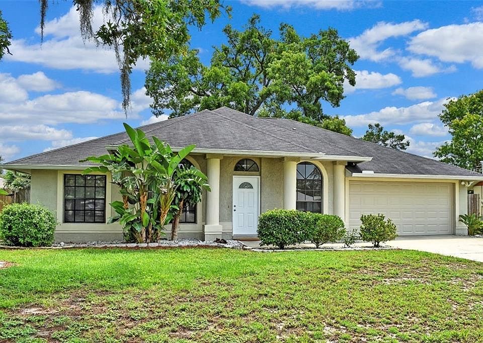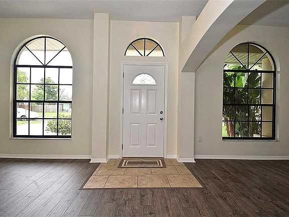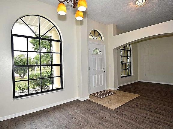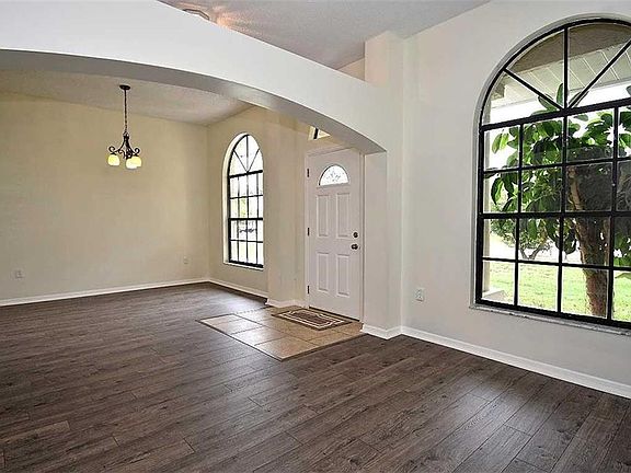 Beautiful 3 Bedroom 2 Bath home with a spacious split bedroom floor plan, volume ceilings and unique architectural details. Fresh NEW interior paint and BRAND NEW wood look flooring throughout the living room, dining room, family room and bedrooms. Eat in kitchen features stainless appliances and pantry. Separate living and dining rooms and an inside laundry. Master bedroom offers a walk in closet and en-suite master bath with a stand up shower and jetted garden tub. The rear screened lanai overlooks the spacious fenced backyard with beautiful tropical landscaping.