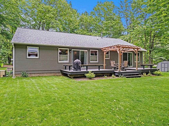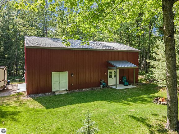 This beautiful ranch nestled in the trees of the HOA-free Carter Woods development is set on a one acre corner lot allowing for privacy and very little traffic! The former builders' home features 3 beds, 2 full baths, and an open concept kitchen/dining/living area all on the main floor. A 30x50 insulated pole building with workshop was built in 2021 for housing toys and includes a half bath! The home includes a built-in entertainment center, whole-home attic fan, and new sliders leading to the 10x36 deck overlooking the spacious back yard. Primary bedroom has an en suite bath along with walk-in closet and sliders to the deck as well. Downstairs is another 1500+ sq ft blank canvas ready for a bed/bath addition, office, family room, or entertainment space. Make it your own! Home updates in 2023 include new furnace and water heater. 2021 brought a new roof, new sliding doors, freshly stained cedar exterior, water pressure tank, and main irrigation control unit. The pole building has a separate entrance off of Minkin Dr, 30x24 workspace, half bath, wired internet access. Upstairs in the barn is another 30x24 area perfect for excess storage! Other property features include a shed for yard tools, freshly tilled garden area, fire pit, chicken coop, and covered space for your firewood. Long Lake public access is minutes away, and proximity to main roads makes commutes to Traverse City and Lake Michigan a piece of cake! There are thousands of acres of state land very close by that provide access to hiking, bike trails, horseback riding, ORV trails, and hunting. This property is begging you to get outside and enjoy Northern Michigan!