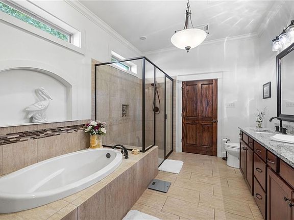 This Model Patio / Garden Home, built by Varuso Homes is one of the 1st 4 in the subdivision. Original owner Updates include 3cm granite throughout, freshly painted, large kitchen sink, new faucets, new disposal, kept original Travertine backsplash. All custom blinds and window treatment remain. Floors are Tile and Wood Plank, Fireplace face is Stone Mosaic, Fireplace floor is Chizled Edge Travertine. Ceiling Fans throughout. Gated subdivision with 2 entrances, Hwy 1085/ Bootlegger & Ochsner Blvd.