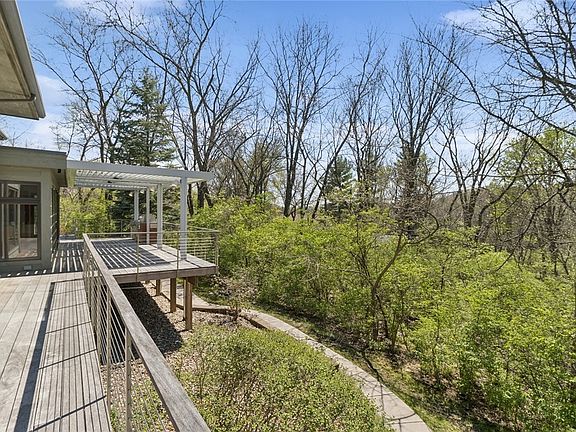 Nestled on 1.27 wooded acres in WDM, this custom Mid Century Modern 1.5 story boasts 4 BR, 6 BA, and 3958 SF with main floor living. Meticulously maintained fixtures blend with upgrades, including a chef's dream kitchen with top-end appliances, granite & SS counters, kitchen annex, and walk-in pantry. Enjoy serene dining by expansive windows, or step onto the Brazilian hardwood deck with your outdoor kitchen. A vaulted living area features a double-sided wood-burning fireplace, while a covered deck offers tons of enjoyment. Upstairs, two BRs with full baths and walk-ins await, one with a cedar closet and sitting room. The lower level adds 1700 sq ft(approx. per seller) of living space, kitchen, plus add'l storage and workshop. Solid wood doors, gutter toppers, a heated/cooled 3-car garage with epoxy floors/2 drains, and garden shed complete this unique blend of timeless architecture and modern comfort.
