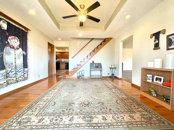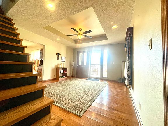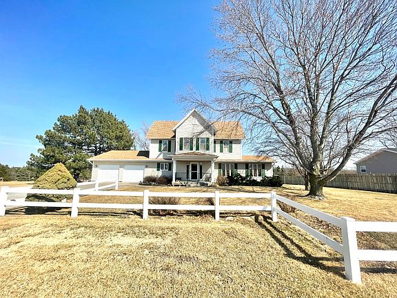 This beautiful home welcomes you before you even step foot inside with a large front yard featuring established landscaping and a split-rail fence. The spacious foyer opens to the expansive family room to one side, open kitchen to the front and the main level bedroom or office. The inviting kitchen features stainless steel appliances, including double wall ovens, and a sink overlooking the back deck and scenic yard. The main level also has a separate laundry/mud room off the garage and a full bathroom. The upper level of the home has four bedrooms, one with a 3/4 bathroom. Two of the upper level bedrooms are receiving new carpet, but hardwood floors are throughout the finished spaces of this home. Two new windows are going in the east bedroom as well. The unfinished basement has ample storage, and space for another bedroom, and is plumbed for a third bathroom. The attached two car garage has a workshop area. In the fenced back yard, you'll find find a partially covered deck with patio and grilling space, established landscaping, and a garden shed. The property reaches well beyond the fenced yard to the back tree line (on adjacent property) and is a perfect spot for a large shop, or fun yard games. This property is within a block's walking distance to the school, and just a few more blocks from the new community swimming pool. Enjoy a taste of the country, with the conveniences of town.