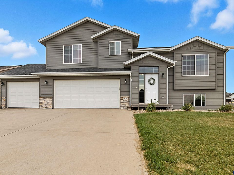 Welcome to this charming home in Hartford, SD. This thoughtfully designed residence makes the most of your living space, featuring a spacious living room, kitchen, and dining area all on one level. The upper level includes a full bathroom, two bedrooms, and a conveniently situated laundry room, while the lower level includes a family room, full bathroom, and an additional bedroom. Don't forget to check out the heated three-stall garage—a true gem! All of this is set on an impressive lot, complete with an expansive backyard featuring a fire pit, fence and extra storage shed. Brand new carpet and newer roof (2022). Seize the opportunity to make this delightful home yours!