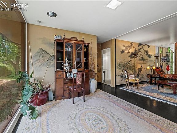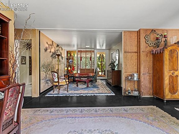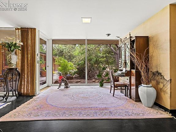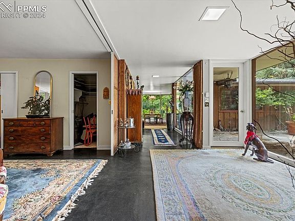 This magical creek property was a former zoo with elephants and peacocks roaming the 1.33 acres of Japanese gardens and the profusion of many varieties of trees. The impact begins immediately upon entering the private road as you wind around 100 year old trees and come to this stylish Mid Century Modern custom designed masterpiece. Wildlife is abundant and the peaceful sound of the rushing water only adds to the serenity and privacy this one-of-kind property has to offer. You and your guests will savor the time spent on the two bridges and beautifully landscaped estate. It's quite a gem with 8 foot glass doors and floor to ceiling windows in every room. The 913 square foot covered patio is perfect for entertaining vast amounts of people. A tastefully and newly remodeled ensuite accompanies the oversized primary bedroom. Radiant hot water heat in the concrete floors make for the most warm and comfortable way to live throughout the ice cold winters. The house was custom built and continues to be period authentic with original metal cabinets in the kitchen, all copper gutters, tons of storage, and concrete floors. Stepping into this perfect size 2504 sf rancher harkens back to 1950 when life was simpler and neighbors gathered under the covered patio on cool summer nights sipping their favorite beverage while listening to the calming sound of Cheyenne Creek, one of the last creeks in Colorado running through residential property. You can't beat the location as it's within a mile of the 5 star Broadmoor Hotel, hiking trails, post office, library, and fabulous restaurants.. Award winning District 12 schools are only a few blocks away. It is no exaggeration that you will never find such a unique property anywhere in Colorado Springs. With an irrigation well you can keep this park like setting beautifully manicured without the high water bills.