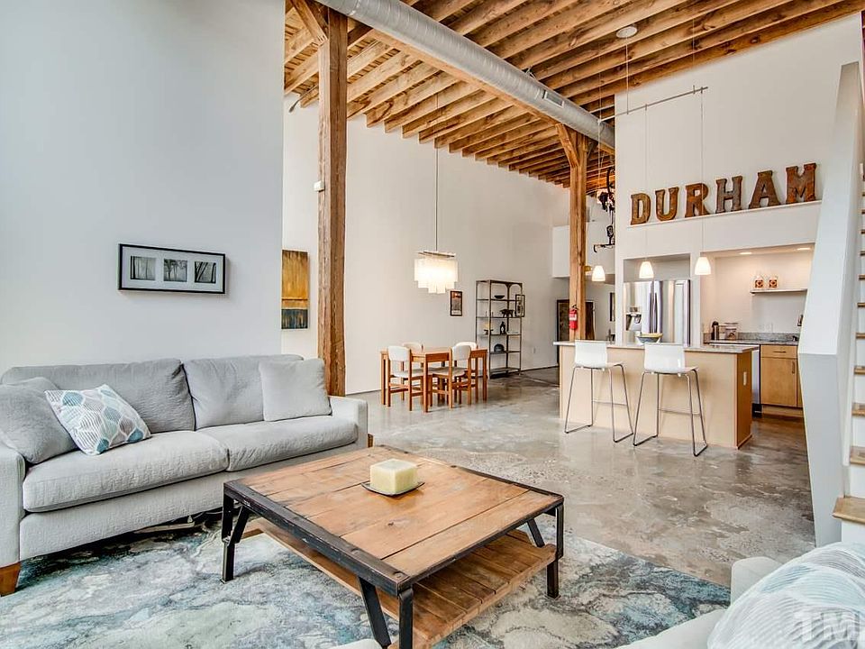 The BEST price in Downtown Durham! Urban loft blending historic & upscale features. Open floor plan, concrete floors, original rustic beams, 20 ft ceilings, gas range, granite, wine cooler, custom barn doors, large master BR retreat w/sitting/office space, baths remodeled to perfection, ELFA closet shelving, enclosed patio w/premium decking & turf for pets. Stellar location, 5 min walk to Central Park, Cocoa Cinnamon, Motorco, Fullsteam, Ellerbe Wetlands (2019). 2 deeded parking spots. Stunning interior:)