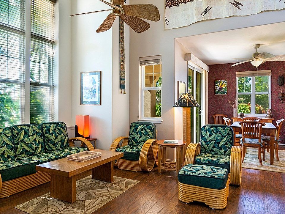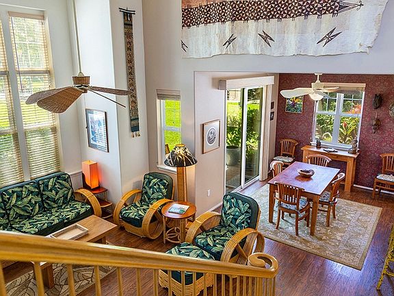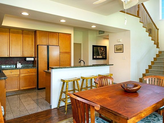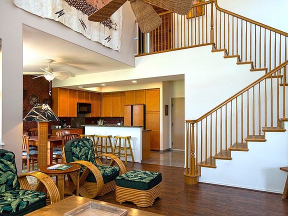 Step into this uniquely furnished 2 bedroom 2 bathroom unit in Waikoloa Colony Villas building #7 which is located midpoint in the complex. This end unit provides lots of large open green space around the building so if you enjoy condo living but long for some privacy, this unit is for you and being an end unit eliminates neighbors adjacent to or above you. This well kept 2 story unit features vaulted ceilings, granite countertops in the kitchen and marble bathroom vanities. Enter the master bedroom upstairs through a beautiful Koa louvered door. Master bedroom has a good size walk in closet with a safe for your valuables. Master bathroom has a soaking tub with separate shower and double vanities. The second bedroom is downstairs which provides for ultimate privacy and separation from guests. This unit not only comes with a 1 car garage but has an additional parking space adjacent to the building, a perk that only a handful of units enjoy. Waikoloa Colony Villas complex is gated and offers 2 pool areas, tennis courts, fitness center and a clubhouse with a kitchen providing an excellent space to have parties and gatherings. Nearby to the complex is the golf clubhouse and the Robert Trent Jones Junior designed King's Course. Waikoloa Colony Villas is within close proximity to King's Shops and Queens Marketplace with plenty of shopping and dining venues. The famous Anaeho'omalu Beach also known as "A-Bay" is also nearby. Maintenance fees include: Cable, internet, water, landscape maintenance, sewer, trash pickup and quarterly pest maintenance inside and out. Move in ready, just bring your toothbrush.