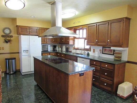 Well kept home in a beautiful country setting with 2 acres and a pole barn. Kitchen has been updated with Silastone counter tops, under counter sink & white tile back splash, has a built-in desk and over-sized pantry. The living room has a wood burning fireplace, built-in cabinets and shelves and access to the 19 x 9 deck. The master bathroom was updated with a new tub/shower and counter top, & has a big linen closet. The utility hall conveniently located off the garage has a big closet & cabinets. The basement family room has a wood burning fireplace and leads to the patio. There are 2 bedrooms in the basement and another bathroom, which has also been updated with a tile floor, corner shower and pedestal sink. There is an unfinished 17 x 10 storage room. The barn has a concrete floor, large loft storage area, insulated paint closet, 2 ceiling fans, refrigerator, 15 x 11 office with heat and air wall units, built-in closet lockers, cabinets and shelves & TV hookup. Seller requests this property be sold As-Is. Included in the sale: Refrigerator, range/oven, dishwasher, washer, dryer, freezer, all window treatments, refrigerator in the barn, propane tank behind barn, wall heater and wall a/c unit in barn, gazebo and swing. Seller is also including an HMS One Year Home Warranty for the Buyer. The view from this property is outstanding from every direction and is surrounded by fields.