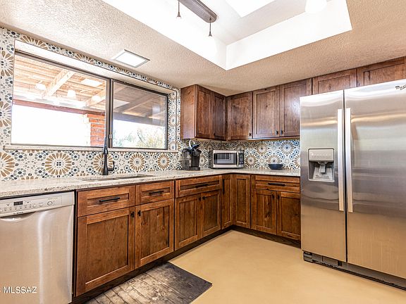Wonderful ranch home in Catalina Foothills located at the end of a cul de sac. You will love this completely updated burnt adobe home! Enter from the front porch, where you have the lovely mountain views to find a spacious living room with beam ceiling and dining room area just beyond. Kitchen is open to family room with corner fireplace. Gorgeous Rogo's floors throughout! Kitchen completely remodeled in past year with new cabinetry,, granite countertops with leather finish, stainless steel appliances and so many special touches! Both baths also completely updated with custom tile surrounds in showers, new vanities, lighting, tile accent wall at vanity and accessories. Primary suite features walk in closet & private bath both with barn door entries. Wonderful full length back ... covered patio with built in BBQ area, it is peaceful and pleasant to enjoy this space. 14 SEER HVAC, roof serviced and in warranty, garage has large workspace and insulation overhead, plus access to back walled in utility area. Generous lot is positioned well for privacy. Located in highly rated Catalina Foothills School District. This is a MUST SEE home you will not want to miss!