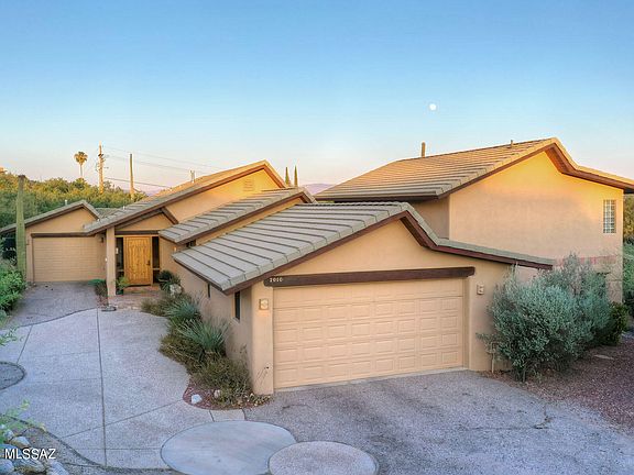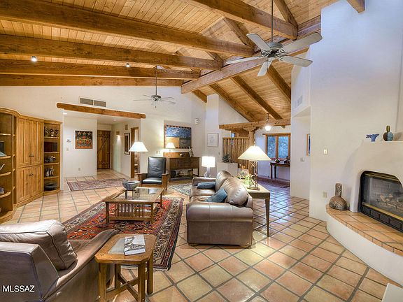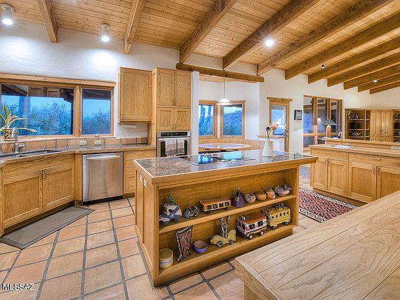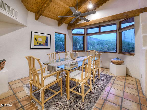Nestled in the sought-after Foothills 2 subdivision, this exquisite 4-bed, 3.5-bath home seamlessly blends Southwestern & Craftsman design into a cohesive architectural wonder. Cathedral ceilings with clearstory windows flood the 3190 sq ft space with natural light. Kitchen features custom solid wood cabinets and the dedicated breakfast nook creates an and inviting atmosphere. Wood plank ceilings supported by natural wood beams & custom hardware combine with Saltillo tile flooring add a touch of Tucson charm. The primary bedroom is spacious & well-appointed with tasteful built ins, large walk in closet & amazing desert views. Outside, a sparkling spa cascades in the custom pool providing a serene oasis, while offering breathtaking Catalina Mountain views. See the More Tab. The covered south-facing porch is perfect for enjoying downtown and A Mountain views. With a 2-car garage and a separate 1-car toy garage, this home offers ample parking and storage space. This unique home allows you to be surrounded by the beauty of the native Sonoran Desert vegetation while living in luxurious and tasteful surroundings. This property is a true gem for those seeking a unique blend of architectural styles and natural beauty