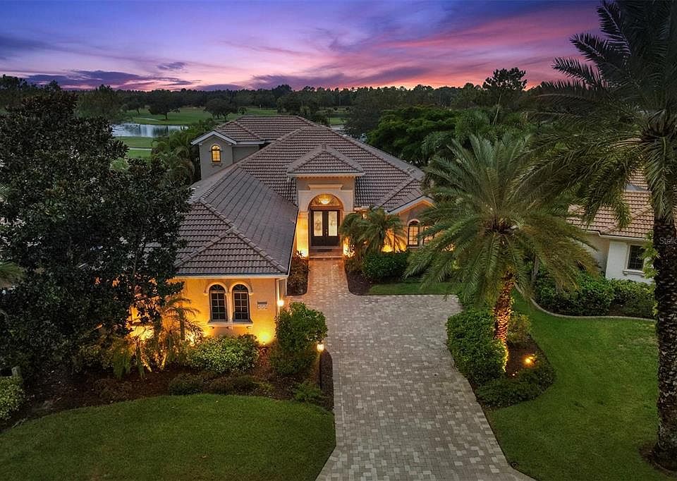 Welcome home! Prestigious living in maintenance-free Vilamoura on a quiet cul-de-sac is now available in Lakewood Ranch Country Club. Located along the 10th hole of the Cypress Links golf course designed by Arnold Palmer is this spacious and luxurious residence built by Gibraltar featuring over 4,000 square feet of upgraded living to suit any lifestyle. Open the double-door entry and be wowed by the architectural styling, inviting neutral color palette, and wide views of the golf course and lake right from the front door. The spacious living room is perfectly situated to take in the views while maintaining sophisticated entertaining with a lighted oval tray ceiling, crown molding, columns with moldings, and large-format diagonal tile flooring. The adjacent formal dining room features the same upgrades plus French doors opening to the enchanting courtyard with fountain. The chef’s kitchen showcases plentiful granite counters, a central island with bar-height seating, stainless steel appliance suite, mosaic tile flooring, central vacuum system, and a large walk-in pantry with an extra hidden pantry inside. Casual living in the dinette and family room shows off views of the golf course from every angle and provides the perfect place for gathering. Step through sliding glass doors to the expanded paver lanai featuring an extra seating area positioned to take in the western rear exposure with spectacular sunsets over the golf course, lake, and oak trees. The outdoor kitchen and covered entertaining area offer the ideal location for grilling out any time of the year. The sparkling pool with spa is surrounded by a lighted screen enclosure and features an electric heater for energy efficiency. Also taking advantage of the western exposure is the master bedroom with a seating area overlooking the pool and view, wood flooring, custom ceiling detailing, and 2 walk-in closets with custom shelving plus a linen closet. The master bathroom conveys dual sinks across split vanities, abundant storage, walk-in shower with bench, and a large soaking tub by Jacuzzi. Nearby is the private study with custom built-in desk and bookcase, plus an additional bookcase with a murphy bed to make this space functional for additional guests. If you’re looking for more spaces to take in the extraordinary views, head upstairs to the spacious bonus room with wet bar and large windows, plus a screened-in balcony. Also upstairs is the 4th bedroom with an en-suite bathroom, plus the entire second level could be closed off with a door to create a private in-law suite level. Downstairs you will find the other 2 guest bedrooms and a full guest bathroom, plus laundry room with 2018 washer and dryer. The 2-car garage is oversized to also accommodate a golf cart, plus has a storage closet, you’ll also find additional parking at the parking pad on the paver driveway. Extra upgrades include 2020 AC units, 2023 smoke detectors, and 2023 LED recessed lighting. The Vilamoura neighborhood features include grounds maintenance, paver sidewalks, and is one of the closest neighborhoods to the Main Clubhouse. Appreciate a state-of-the-art fitness center, clubhouse, junior Olympic-sized pool, three 18-hole championship golf courses, and more by becoming a member of the Lakewood Ranch Country Club. Lakewood Ranch is the top multi-generational community in the country for five years in a row with award-winning shopping, dining, A-rated schools, parks, and nearby beaches.