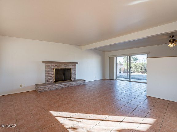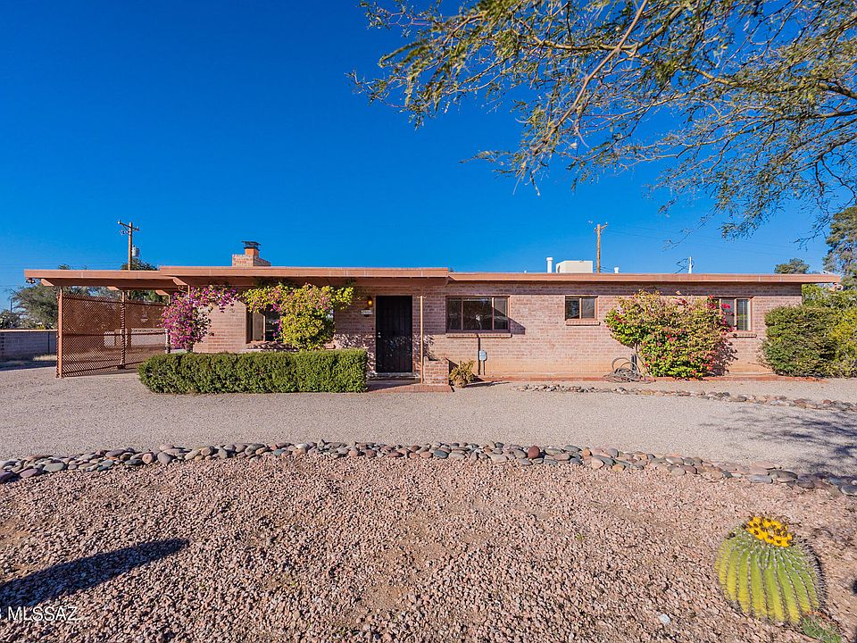 A delightfully updated Mid-Century charming red brick home with sweeping views of the gorgeous Catalina Mountains and Mt. Lemmon is now available and spotlessly move-in ready. Lots of street appeal, with a circular drive and a front porch covered with bougainvillea, and a lovely slice of history: original and clean-as-a-whistle GE cooktop and wall oven (where are Ozzie and Harriet?), original and sparkling-clean light fixtures, original counter tiles and as cozy as can be! A brick-surround original wood burning fireplace in the large living area adds to the cozy feeling. Located in a lovely quiet neighborhood that shows tremendous pride of ownership with handsomely maintained homes all around. Stunning views from living room, kitchen and primary bedroomwake up to views of Mt. Lemmon from your bed! Baths are partially upgraded and in excellent condition. Primary bedroom has ensuite bath and sliders to the oversized rear yard with room for a pool/spa and your choice of lush landscaping. A laundry room includes updated washer/dryer and storage cabinetry. Handsome updated tiles in main areas and freshly-cleaned carpets in bedrooms. There's an alley in back and space on the side of the home as well, providing privacy from neighbors. Abundant shopping, services, terrific restaurants and top-notch medical services are nearby. This may be an "oldie" but it is definitely a "goodie"!