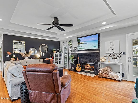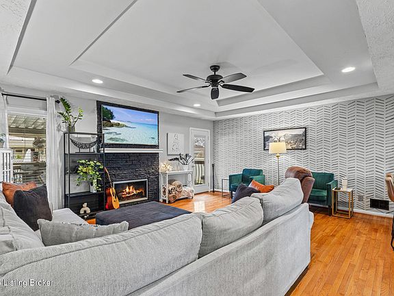 Nestled on a quiet street in highly sought-after Fern Creek, this stunning one-story ranch home with a full finished basement is truly one of a kind. Boasting three bedrooms and two full baths, this home is packed with updates and stylish finishes throughout. The primary suite has been beautifully renovated, featuring a large walk in tiled shower, upgraded shower fixture with body jets, new tile flooring, a modern vanity, an elegant light fixture, and fresh paint. The primary bedroom itself showcases new flooring, fresh paint, a Wainscot accent wall, and a tray ceiling, creating a serene retreat. The hallway bathroom has also been updated with wainscoting and stylish decor. Step into the inviting great room, where you'll find a striking stone fireplace, a double-tray ceiling, and all-new recessed lighting. The home boasts hardwood floors throughout, adding warmth and charm. The kitchen features stainless steel appliances, a newer dishwasher and garbage disposal, and sleek granite countertops. The finished basement is a true showstopper, featuring a custom bar with granite countertops, built-in shelving in front of a mirrored backdrop, a beverage refrigerator, and gorgeous wallpaper. The durable LVP flooring ensures long-lasting beauty, while a custom handrail and wainscoting on the staircase add an elegant touch. Outdoors, you'll fall in love with the large inground pool, perfect for summer relaxation. The spacious covered deck overlooks a private, beautifully landscaped backyard, offering the ideal setting for entertaining or unwinding. For added convenience there is a large 2 car detached garage. With all-new high-end light fixtures, fresh paint throughout, and thoughtful design details at every turn, this home is move-in ready. Conveniently located just minutes from expressways, restaurants, shopping, parks, and family activities, it offers the perfect blend of comfort, style, and accessibility. Don't miss your chance to own this exceptional home!