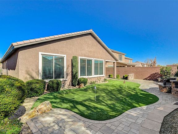 Charming single-story home located in the desirable Mountain’s Edge community, featuring a private backyard with a 4-hole putting green and soothing waterfall. Bright and open floor plan with abundant natural light throughout. Offers 3 bedrooms plus a den with built-in cabinetry. The kitchen opens to the great room and includes granite countertops, stainless steel appliances, pendant lighting, and a large island with counter seating. Upgrades include a new A/C unit installed in 2025, a tankless water heater, and a water conditioning system. Seller will provide a $3,000 flooring credit with a full list price offer. Be sure to see the many parks, walking paths and playgrounds within the Mountains Edge master planned community.