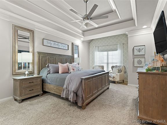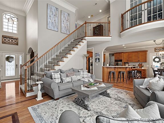 Seller is offering a 10k allowance at closing towards upgrades. This stunning 5-bedroom, 4-bathroom home in Westridge Forest is the perfect blend of elegance, style, and modern comfort. While it boasts a Lanesville mailing address, it’s located in the sought-after Floyd County Schools district. Set on nearly an acre, this home offers plenty of space for both indoor and outdoor living. Step inside to be wowed by the dramatic living room, featuring soaring ceilings and a striking fireplace that creates a bold, inviting space. The elegant formal dining room is ideal for entertaining, while the open second floor overlooks the spacious family room, enhancing the home's airy and grand feel. Meticulously updated, this home features a brand-new theater room, a fully renovated basement with a stylish bar and large office, and fresh paint throughout. New light fixtures, two new water heaters, and a grinder pump in the basement ensure both style and functionality. The back porch comes with an automatic awning, perfect for relaxing or entertaining outdoors. The oversized owner’s suite is a luxurious retreat with a spa-like bathroom, while three generously sized bedrooms upstairs provide ample space. Located near the interstate, this home offers the perfect mix of privacy, convenience, and easy access to everything you need. With its exceptional design, this home oozes class and sophistication—don’t miss out!