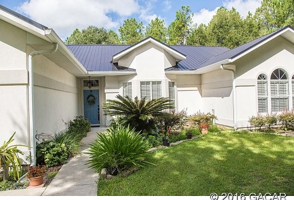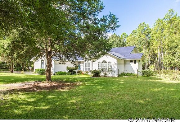 Move in ready 4 bedroom 2.5 bath split floor plan home on 4 acres in between the city of Newbery and High Springs. Newer metal roof and a 3 car side entry garage plus a newer AC Under 5 years old. This home offers a formal entryway with tile a family room plus a great room with a wood burning fireplace. There are plantaion shutters on all the windows in the home. This home offers an inside laundry room with a sump sink, The formal dining room has a sliding door to a large screened in porch to view all the natural wild life. The master bedroom is massive plus there is bonus extra space perfect for an office or reading area. The master bath has double sinks, garden tub plus a stand up shower. The am