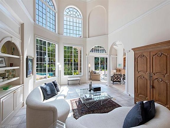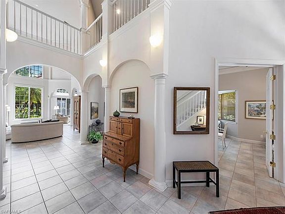 V.2631 This residence offers a dramatic two-story foyer, with volume ceilings that lead into the living room. Wall of windows, with view of pool/patio area and golf course with water beyond, fill the space with natural light. Open floor plan includes family room, kitchen with granite counter tops, new stainless appliances and beautiful oiled wood floors; new carpet. Large formal dinning room with bay window. All bedrooms have own private bathrooms. Roof to be replaced by seller. Isle Verde is a gated community within Pelican Bay.