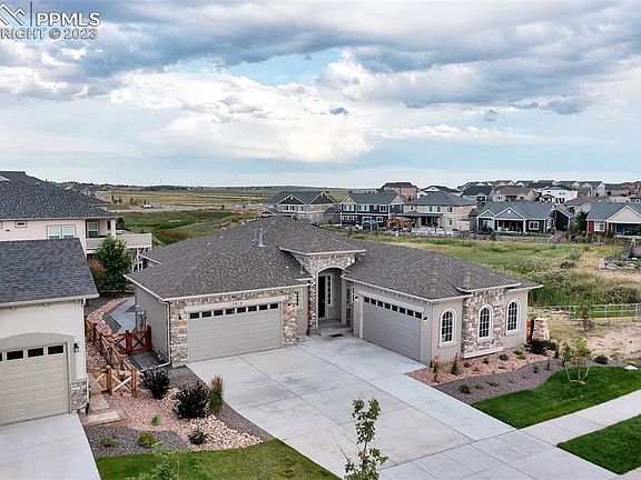 Stunning Ranch home with lots of upgrades in Banning Lewis Ranch!! This home features 4 bedrooms, 3.5 bathrooms, 4 car garage and spectacular views on a large lot that backs to open space. The main level features the great room with gas fireplace, open concept kitchen with gas stove and spacious dining room. The main level also features the primary bedroom with a fabulous bathroom featuring an enlarged shower with 2 shower heads. A second en-suite is also located on the main level. The finished basement includes two more bedrooms, a full bath, a theater room complete with a projector and 110 inch screen and a wet bar; perfect for entertaining! The yard is fully landscaped, with a covered porch. Additional features are the finished 4 car garage, CAT 5 wiring throughout the home, NEW LVP flooring installed December 2022 and paid off solar panels that will reduce your electric bill! This property is minutes away from schools and parks. Located in the Banning Lewis Ranch community with amenities galore, including neighborhood schools, over 75 acres of parks/trails/open space, tennis courts, basketball court, rock climbing parks, zip-lines, access to pools, splash pad, water park, and dog park. Recreation center houses a fitness center and also regularly hosts classes and events for all ages. In the summer months, catch a neighborhood concert, festival, food trucks, farmers market or enjoy other regular community events. This community has it all! You will fall in love with this home and location!