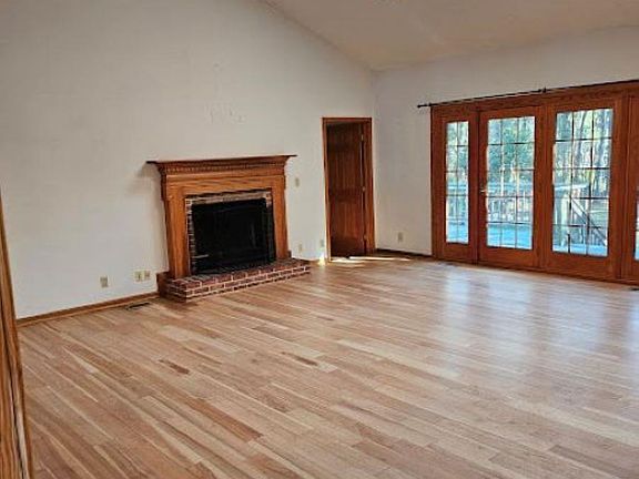 Relax in the expansive living area accentuated by a cozy wood-burning fireplace. Enjoy the ambiance of cathedral ceiling and natural light streaming through skylights, along with breathtaking views of the pond through elegant glass French doors that open to a large backyard deck—ideal for outdoor gatherings!
