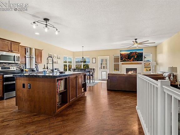 Welcome to a home designed to inspire and delight, offering breathtaking views of the Rocky Mountains, from Cheyenne Mountain to Pikes Peak. Enjoy serene evenings on the deck as the sun sets behind the indigo peaks, creating the perfect backdrop for your Colorado lifestyle. Situated near Cottonwood Creek Trail, you'll have walking access to its fantastic amenities, including parks, a swimming pool, sledding hills, a roller hockey rink, and a disc golf course. Everyday conveniences like Starbucks, King Soopers, and a variety of dining options are just minutes away, ensuring both recreation and essentials are close at hand. The open floor plan effortlessly blends comfort and function. The kitchen, complete with granite countertops, upgraded cabinetry, and a hammered copper farmhouse sink, flows into the living room, where a cozy fireplace invites relaxation. Step directly onto the deck for seamless indoor-outdoor living, perfect for entertaining or unwinding. Unique updates throughout include Italian porcelain tile, an art glass backsplash, and an art glass vessel sink in the powder room, along with a Tesla charging station in the garage. The front and back yards are thoughtfully xeriscaped with turf, creating a low-maintenance, water-conscious outdoor space to enjoy year-round. Additional features include built-in shelving in the garage. The roof was replaced in September with brand-new Class 4 impact-resistant shingles, offering durability and peace of mind. With its stunning views, excellent location, and countless upgrades, this property is ready to welcome you home. Schedule your showing today and experience everything this home has to offer!