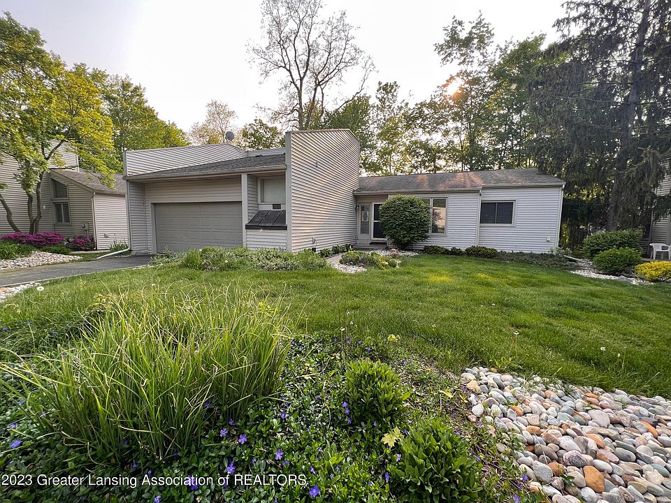 Welcome home to this stand-alone ranch condo in a cul-de-sac with finished basement in Delta Township! Enjoy watching the deer & turkeys in your own backyard. This 3 bedroom condo with 3 full baths will meet all of your needs. First floor includes a den that can be used as an office or 4th bedroom. The large living room with gas fireplace includes gorgeous views out the back of the condo. Create a formal dining space at one end of this large space or use the eat-in kitchen. First-floor laundry is just inside the door from the garage. The large primary suite with walk-in closet and tiled bath has sliding doors that open right out onto the deck. One more bed room and another bath completes the first floor. Downstairs is a family room and another large bedroom & bath. Home warranty included.